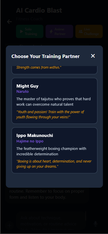 Get instant, gamified motivation for your fitness journey. Train with AI coaches inspired by anime characters who remember your progress and push you to achieve your ultimate form.
